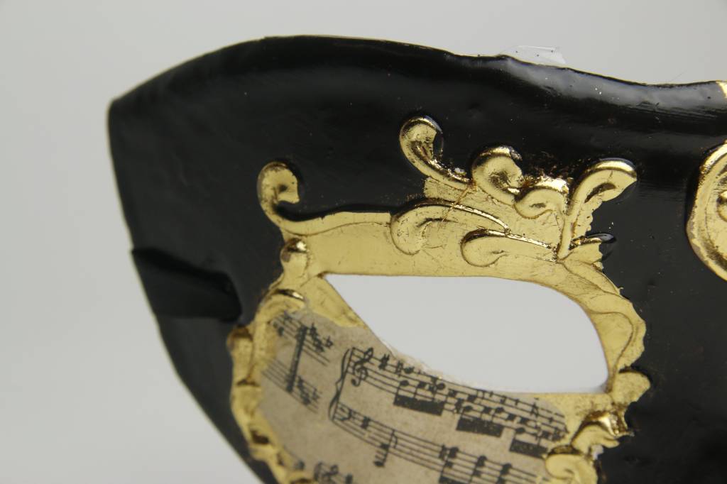 La maschera veneziana 'Wagner' deve il suo nome al famoso compositore Richard Wagner. Questa maschera 'musicale' è particolarmente adatta per le occasioni speciali, balli di gala ed eventi in maschera. Copertura in oro scuro in stile Barocco e spartito musicale danno un tocco di classe a questa maschera, rendendola l'accessorio ideale da abbinare a diversi costumi.